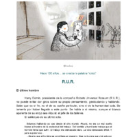 - El artículo cuenta la invención de la palabra robot, que surge de R.U.R., una obra checoslovaca del 20, escrita por Karel Čapek. La palabra, surgida del checo, se relaciona con “trabajo duro” y “servidumbre”, pero en la obra esto se invierte y es el hombre quien se convierte en siervo del robot. La humanidad desaparece. No porque estos robots sean asesinos, sino porque al eliminar el trabajo –el hombre ya no debe hacerlo para subsistir– el mundo se ha vuelto quieto sin sus males, la gente ha dejado de tener hijos, la esperanza ha desaparecido. Los dioses que distintas civilizaciones han creado son reemplazados por las “nuevas tecnologías”. El autor del texto se pregunta: cien años después del invento de la palabra robot, ¿estamos siguiendo los pasos de la humanidad en aquella obra? Luego, también se pregunta si, más allá de las tecnologías, la tecnocracia –el saber ultra especializado y específico de algunas personas (¿robots humanos?)– y la dependencia actualmente puesta por la humanidad en ella no nos llevará, finalmente, por el mismo camino.