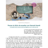 - El artículo propone releer Entre el pasado y el futuro de Hannah Arendt. Su autora, Adriana Fontana, considera que es posible repensar desde allí el oficio de enseñar y las experiencias pedagógicas de este tiempo. Replanteo necesario no solo por lo que significó y significa todavía el COVID-19, sino también por los interrogantes que las nuevas tecnologías y su inclusión y uso en la educación venían ya abriendo. Para esta propuesta y análisis, Fontana retoma pasajes de Arendt, pero también el trabajo en el ISEP y su recorrido. Del Instituto, recupera particularmente un texto escrito por Rubén Benítez –realizado como parte de un ejercicio de una actualización académica–. Con Arendt, Meirieu, Masschelein, Simons y otros, reflexiona para pensar, entre otras cosas, las posibilidades de una pedagogía en ciernes.