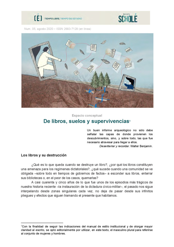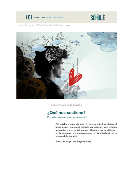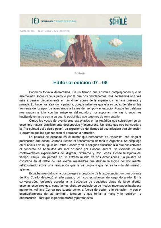 Percaz, Laura | El artículo presenta las ediciones 7 y 8 de Scholé al hacer un repaso por los temas y reflexiones de los textos que las conforman. Mediante el despliegue de diferentes acontecimientos, la autora propone que sea la voz humana multiplicada en relatos, en conversaciones, en la invocación hecha en cada cita, en cada palabra que serpentea por páginas como estas, la que pueda ensanchar y encantar nuestra experiencia. |