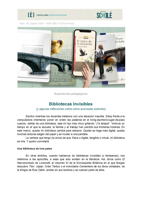 Daveloza, Valeria | El artículo aborda los nuevos espacios, escenarios y dispositivos para la lectura a partir de la modalidad escolar que permitieron los primeros meses de pandemia en Argentina. La autora reflexiona en base al acceso a libros digitales, por ejemplo, que antes era impensado compartir desde el rol docente, y se pregunta por las nuevas posibilidades de generar, conformar y convidar la propia biblioteca para que se vuelva compartida y resignificada en la vida escolar. |