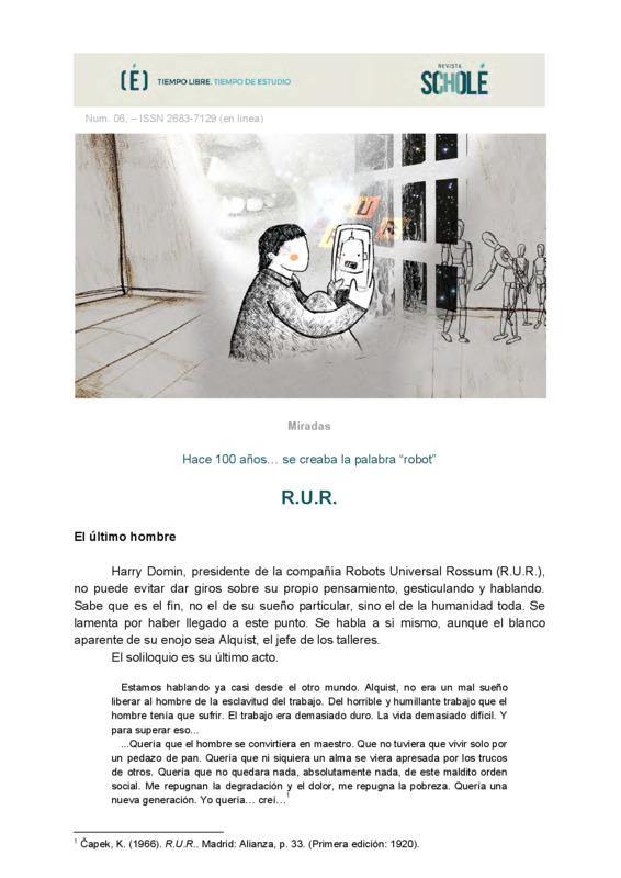 Revista Scholé | El artículo cuenta la invención de la palabra robot, que surge de R.U.R., una obra checoslovaca del 20, escrita por Karel Čapek. La palabra, surgida del checo, se relaciona con “trabajo duro” y “servidumbre”, pero en la obra esto se invierte y es el hombre quien se convierte en siervo del robot. La humanidad desaparece. No porque estos robots sean asesinos, sino porque al eliminar el trabajo –el hombre ya no debe hacerlo para subsistir– el mundo se ha vuelto quieto sin sus males, la gente ha dejado de tener hijos, la esperanza ha desaparecido. Los dioses que distintas civilizaciones han creado son reemplazados por las “nuevas tecnologías”. El autor del texto se pregunta: cien años después del invento de la palabra robot, ¿estamos siguiendo los pasos de la humanidad en aquella obra? Luego, también se pregunta si, más allá de las tecnologías, la tecnocracia –el saber ultra especializado y específico de algunas personas (¿robots humanos?)– y la dependencia actualmente puesta por la humanidad en ella no nos llevará, finalmente, por el mismo camino. |