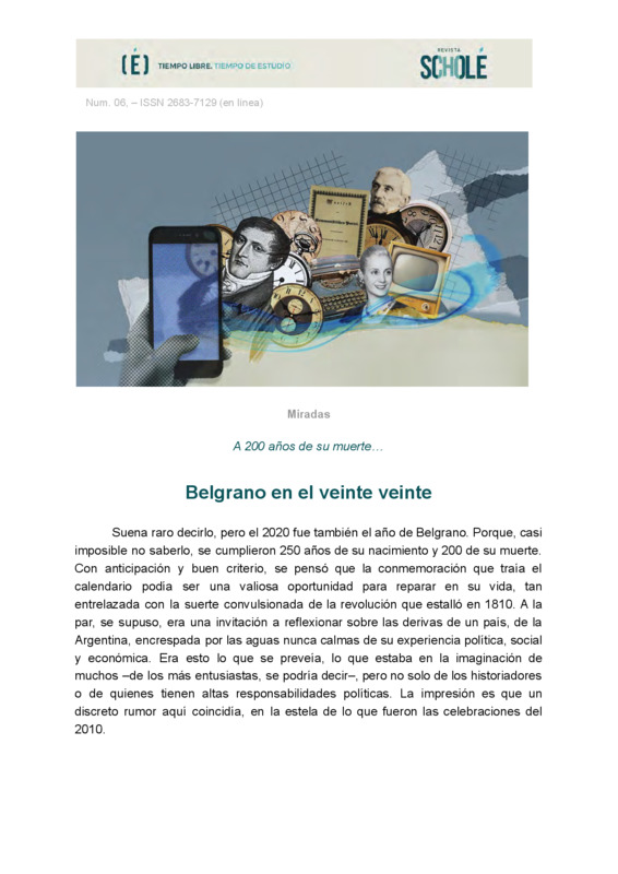 Trímboli, Javier | El artículo conmemora los 250 años del nacimiento de Manuel Belgrano y los 200 de su fallecimiento en el año 2020. Pero la pandemia no permitió un festejo que podría haber sido similar a las celebraciones del 2010, con conversaciones en escuelas, institutos, profesorados, universidades, museos y centros culturales. El autor reflexiona sobre lo que pudieron haber hecho los próceres del pasado ante la realidad del virus y cómo la autoridad del pasado decrece ante lo nuevo como desastre. |
