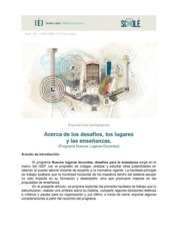 Perazza, Roxana | El artículo presenta al programa “Nuevos lugares docentes, desafíos para la enseñanza”, perteneciente al ISEP. Su coordinadora y autora de este texto se propone explicitar las primeras hipótesis de trabajo que lo estructuraron, realizar una síntesis sobre su historia, compartir algunas decisiones relativas a criterios y pautas para su organización y, por último, exponer algunas consideraciones a partir del recorrido del programa. |