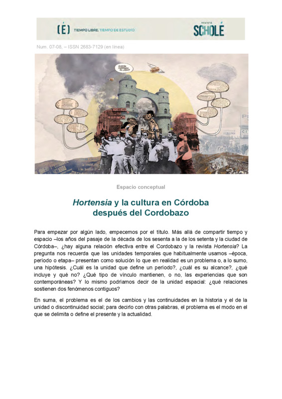 García, Diego | El artículo presenta el vínculo entre la revista Hortensia, fundada hace más de 50 años en Córdoba, y el acontecimiento del Cordobazo. El autor considera tanto al hecho político como a la revista de humor como instancias transformadoras y modeladoras de la realidad cordobesa. Ambas federales, lograron que cambiara la realidad que conformaba la creciente comunidad de sus lectores y sus experiencias. |