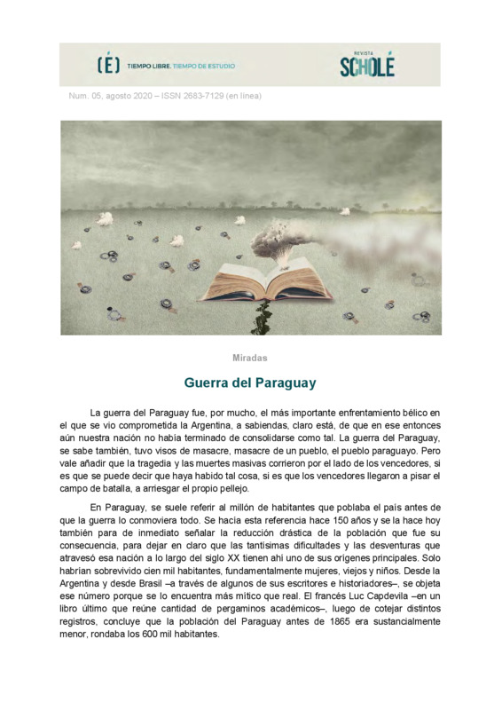 Trímboli, Javier | El artículo conmemora la Guerra del Paraguay, una de las guerras más sangrientas del siglo XIX que pretendió ser olvidada. Ante la pregunta de ¿qué sabemos de ella y qué nos queda por saber, revisar y pensar?, el texto recorre los conflictos que esta guerra generó en la mayoría de los países limítrofes, así como también en Europa, y principalmente cómo se vio involucrada y afectada la Argentina. |