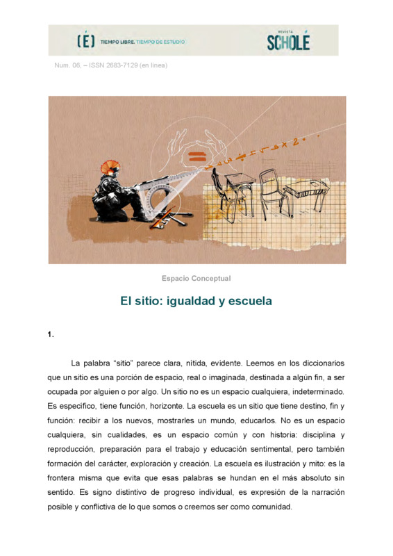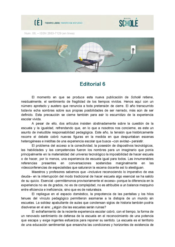 Gotthelf, Ruth | El artículo, escrito a fines del año 2020, presenta la edición 6 de Scholé y hace un balance de las principales reflexiones que los maestros y profesores se hicieron en ese año atravesado por la pandemia en nuestro país. De cara a un nuevo año que comienza, el texto reconoce como necesario un sentimiento de defensa de la escuela para su futuro, a la vez que introduce los artículos de esta edición como esas cartas a amigos, siempre necesarias y urgentes. |