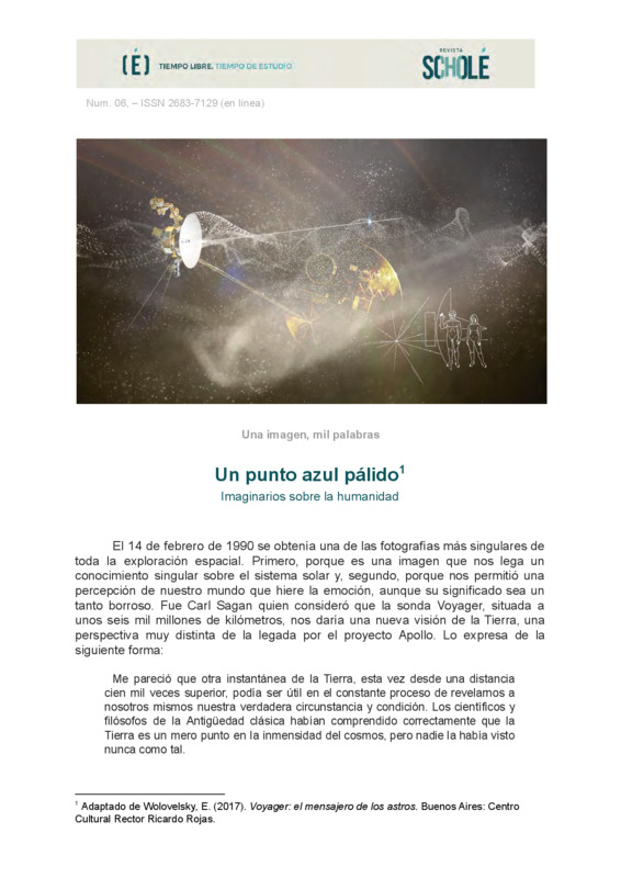 Wolovelsky, Eduardo | El artículo presenta la fotografía del planeta Tierra que el satélite Voyager tomó en 1990. Ante la visualización de nuestro planeta como un pequeño punto azul pálido, el texto se basa en los postulados de Carl Sagan para pensar filosóficamente ante la nimiedad de nuestra existencia; pero el autor cuestiona a Sagan y se pregunta de qué manera podría una foto influir en la vida política, en las tradiciones y en las identidades nacionales, así como en reflexiones sobre nuestro devenir como humanidad. |