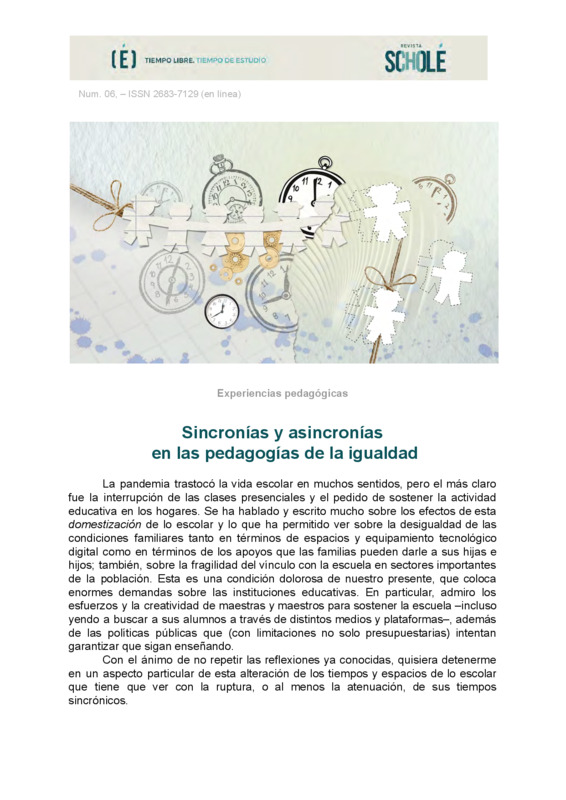 Dussel, Inés | El artículo reflexiona acerca de la interrupción de la presencialidad en tiempos de pandemia, y cómo esto evidenció desigualdades en la escuela. Desde aquí, la autora reflexiona sobre la ruptura en lo escolar de los tiempos sincrónicos y los espacios, historiza la sincronicidad y concluye que la pandemia, como efecto inesperado, puede ayudar a mirar críticamente cómo eran las aulas cuando estábamos todos ahí y habilitar reflexiones para repensar las pedagogías de la igualdad. |
