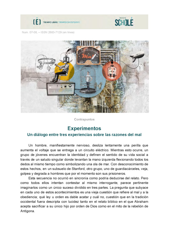 Revista Scholé | El artículo presenta y contrapone tres experimentos que intentaron entender el mal y dieron resultados similares luego de la Segunda Guerra Mundial. Desde la psicología principalmente, el autor se interroga sobre cuál es, entonces, la razón del mal, por qué algunos lo eligen y otros lo resisten, y concluye que los tres experimentos tienen acuerdos en el rol de la obediencia, más que en el de la violencia. |