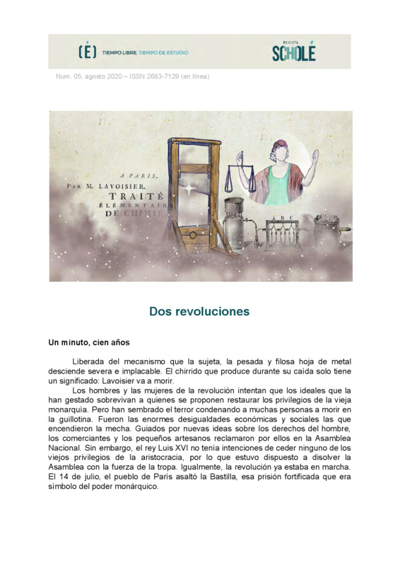 Wolovelsky, Eduardo | El artículo rescata la historia del padre de la química moderna, Lavoisier, en el contexto de la Revolución Francesa, para describir cómo y a través de quién comprobó que un material quemado pesaba más antes de arder, y le puso nombre a aquel nuevo gas: oxígeno. |