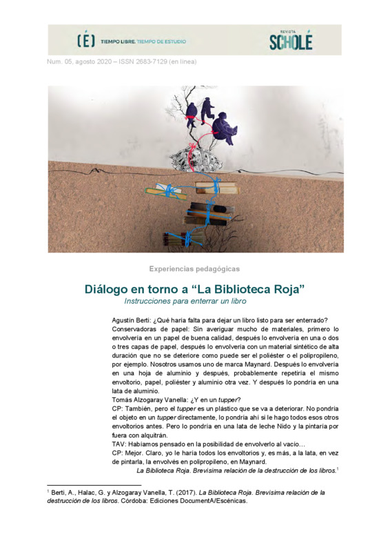 Alzogaray Vanella, TomásBerti, Agustín | El artículo presenta el diálogo que Tomás Alzogaray Vanella y Agustín Berti mantienen sobre La Biblioteca Roja, libro que escribieron junto a otros autores, en el que cuentan y retratan el desentierro de una biblioteca (la de los padres de Tomás) que tuvo que ser escondida entre 1975 y 1976. La dictadura hizo que la pronta recuperación de la biblioteca fuera imposible. 43 años más tarde, junto a un equipo multidisciplinario que incluyó artistas, cientistas sociales, antropólogos forenses, desenterraron los libros y documentaron el proceso. |