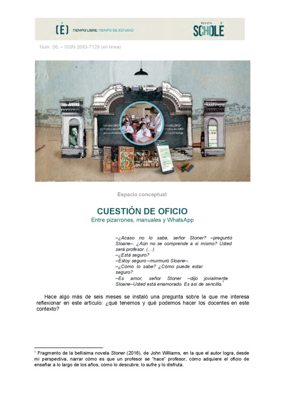 Fontana, Adriana | El artículo reflexiona sobre el oficio docente en tiempos de pandemia, donde la escuela y la enseñanza se vieron obligadas a repensar sus prácticas, a partir de retomar y explorar algunas experiencias docentes narradas en diferentes épocas y geografías: Argelia a principios del siglo XX, Estados Unidos en 1942, Francia a mediados de la década del ochenta y Argentina en el año 2020. Con estas experiencias tan diversas, la autora concluye que, por más que el oficio docente sea un oficio de palabras, precisa, además, de los saberes específicos de la materia que enseñamos, y que hay que reconocer que las tecnologías –desde el pizarrón y la tiza, al video y el celular– cambian y cambiaron históricamente, y lo seguirán haciendo. |