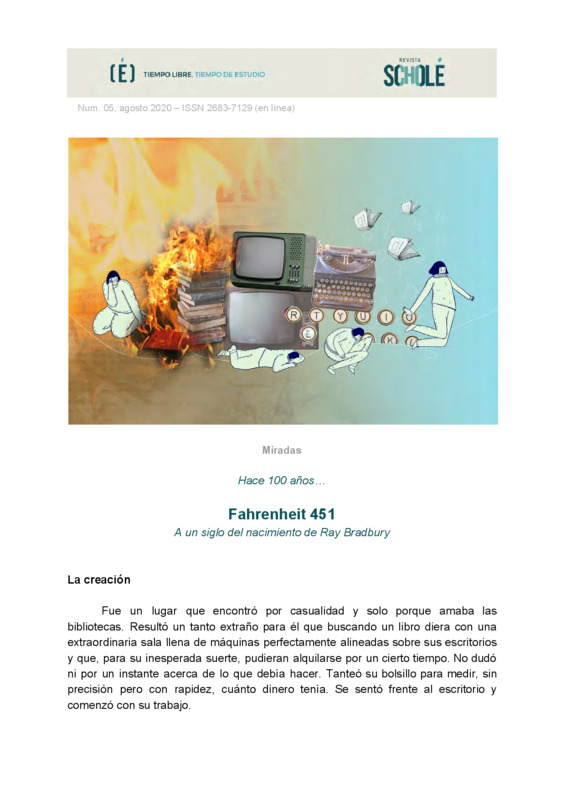 Revista Scholé | El artículo presenta y analiza la obra Fahrenheit 451 de Ray Bradbury, considerada una de las obras más importantes de ciencia ficción del siglo XX. Se rescata a Bradbury de otros novelistas distópicos, en la medida que él ofrece una salida posible guiada no por instrucciones, sino por preguntas y por el pensamiento crítico. El texto conecta este legado con el rol de la educación y se pregunta sobre el para qué de reflexionar y estudiar todo lo que muchos consideran impensable. |