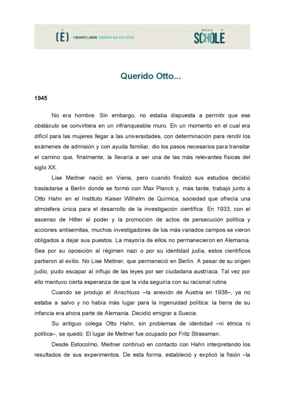 Wolovelsky, Eduardo | El artículo aborda las cartas que la física Lise Maitner le escribió al también físico Otto Hahn en el comienzo y fin de la segunda guerra mundial. Ambos estudiaron y lograron, en conjunto, explicar la fisión del núcleo de los átomos, pero el premio Nobel de Química lo obtuvo solamente Otto. El texto presenta las palabras de Lise, quien, desde el exilio, tuvo la singular capacidad para criticar el compromiso político de muchos científicos con la comodidad del refugio académico y con un nacionalismo tuerto y trágico. |
