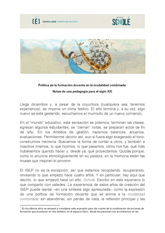 Fontana, Adriana | En este artículo, la directora del ISEP piensa el fin del año 2019 y el comienzo de uno nuevo en el mundo educativo, tanto en las clases como en la gestión. Poniendo a Arendt como marco conceptual, la autora reflexiona sobre estos años de creación del ISEP, de la política pública que permitió la experiencia del Instituto, y sobre la posibilidad de hacer las primeras notas de una pedagogía de la formación docente interpelada por las transformaciones del siglo XXI. |
