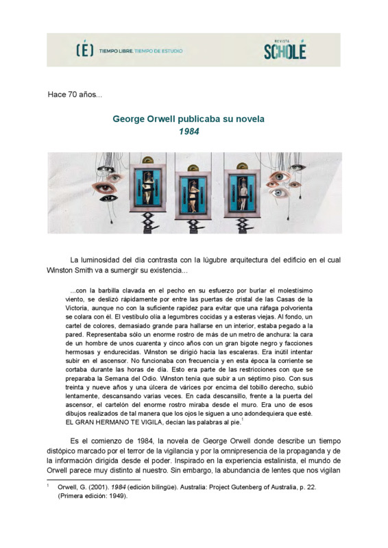 Revista Scholé | En conmemoración de los 60 años de la publicación de 1984, novela de George Orwell sobre un mundo distópico aterrorizado por la vigilancia omnipresente del Gran Hermano e inspirado en el estalinismo, este artículo se pregunta si esta ficción aún guarda relación con nuestra realidad; si lo que Orwell anticipó sobre el desarrollo tecnológico podría facilitar hoy la vigilancia y el sometimiento en términos sociales y políticos. |