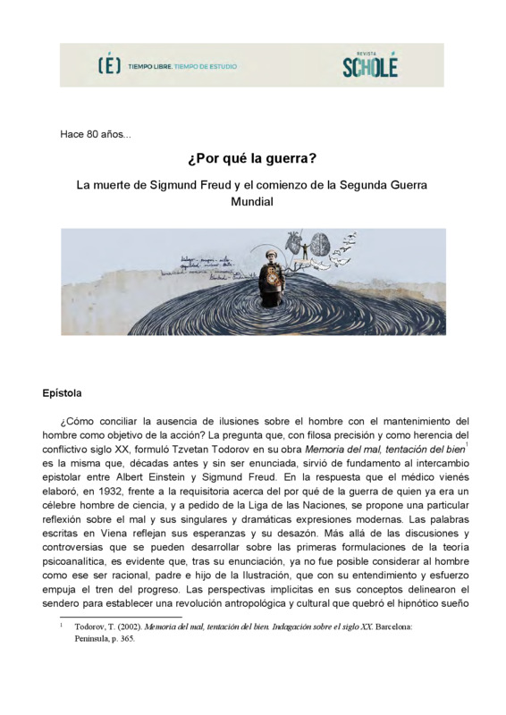 Revista Scholé | En conmemoración de la muerte de Sigmund Freud y el comienzo de la Segunda Guerra Mundial, este artículo repasa el intercambio epistolar entre Albert Einstein y el padre del psicoanálisis poniendo énfasis en su reflexión sobre la guerra y la imposibilidad de considerar al hombre como el ser racional que va camino al progreso. |