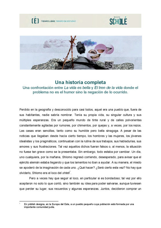 Revista Scholé | Este artículo contrapone dos películas que tienen como tema central el Holocausto. Se trata de El tren de la vida (1998) y La vida es bella (1997). Contemporáneas entre sí, comparten un rasgo fundamental: el humor. Pero lo que el texto va a desarrollar en estas líneas es cómo detrás de la primera película están presentes la comunidad, la solidaridad y, por el contrario, en la segunda hay un relato individualista y una estetización de los campos de concentración y exterminio. La contraposición planteada en el texto demuestra que se puede reflexionar acerca de los significados detrás de cada film en relación a las maneras de hacer memoria. |