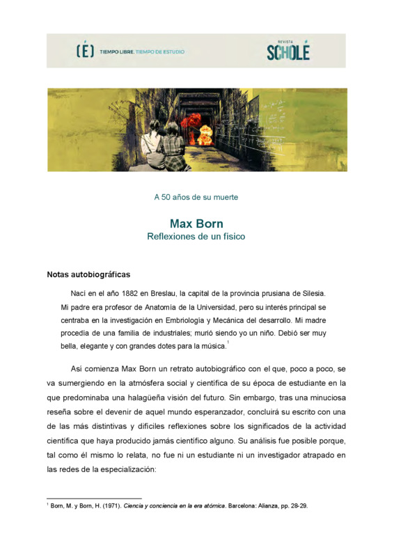 Revista Scholé | El artículo presenta fragmentos autobiográficos de Max Born, el científico alemán al que le resultaba más interesante el trasfondo filosófico de la ciencia que sus resultados concretos. El texto desarrolla la relación que tuvo con un docente, hecho que da pie para reflexionar sobre un mito que se repite en gran parte de la educación y de la divulgación científica, y del que Born fue una de las grandes plumas: la existencia (o no) de una ciencia apolítica. |