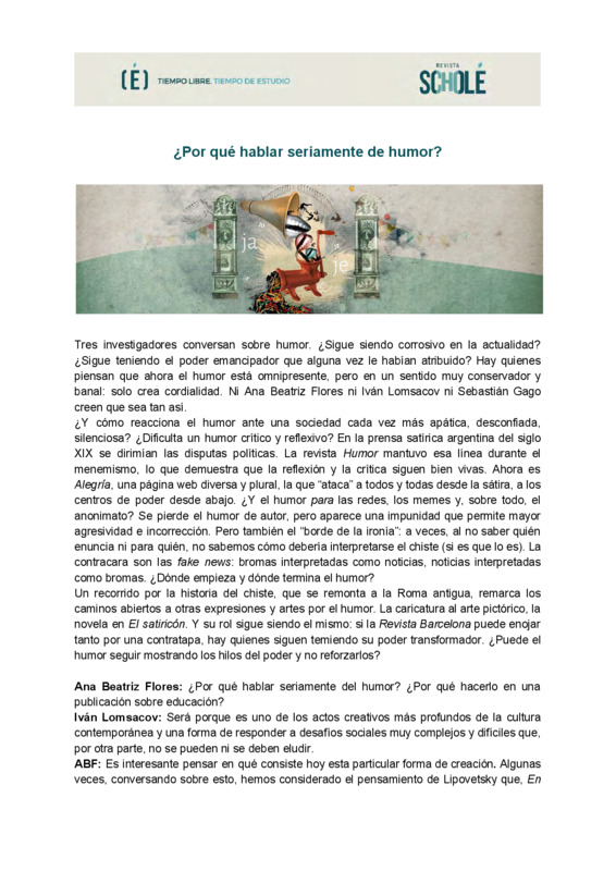 Flores, Ana BeatrizLomsacov, IvánGago, Sebastián | En este artículo tres investigadores conversan sobre el humor y abordan interrogantes como ¿sigue siendo corrosivo en la actualidad? ¿sigue teniendo el poder emancipador que alguna vez le habían atribuido? Se presenta un recorrido por la historia del chiste desde la Roma antigua, que remarca los caminos abiertos a otras expresiones y artes por el humor. De la caricatura al arte pictórico, de la novela a la ironía en revistas. ¿Puede el humor seguir mostrando los hilos del poder y no reforzarlos? |