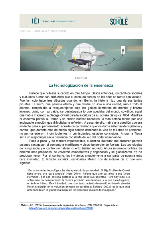 Wolovelsky, Eduardo | El artículo da marco y comienzo a la edición N° 3 de la revista Scholé, la cual intenta concentrarse en la tecnologización de la enseñanza. A partir del caso concreto del uso de la IA en escuelas primarias chinas, relacionado a la ficción orwelliana de 1984, el autor afirma que debemos pensar una y otra vez qué significa formarse y ser docente en estos tiempos. |
