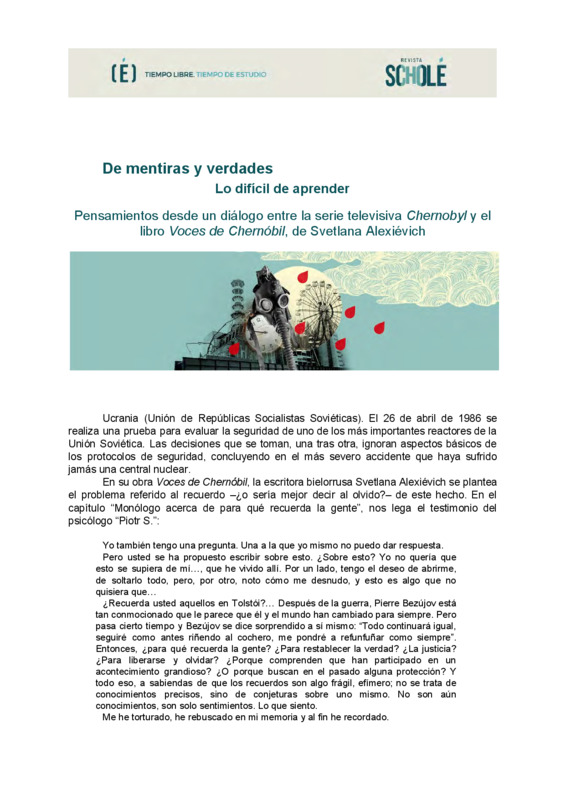 Revista Scholé | El artículo pone en escena el entrecruzamiento entre el libro Voces de Chernóbil, de Svetlana Alexiévich, y la serie televisiva Chernobyl. Ambos productos culturales le permiten al autor pensar en la tragedia, su dimensión y su recuerdo, no solo en la sociedad, sino en particular en cada uno de los que sufren día a día sus consecuencias. |