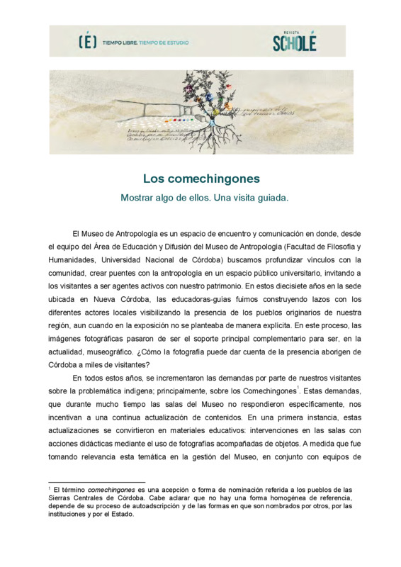 Pedernera, GabrielaBurgos, Silvia | Este artículo presenta al Museo de Antropología de la Universidad Nacional de Córdoba a través de una propuesta educativa que busca reflexionar sobre el pasado y el presente del ser indígena y de su identidad hoy. Las autoras describen la muestra que se lleva a cabo en el museo para mostrar las continuidades, reforzar la construcción de una identidad de la que el aborigen forma parte y así visualizar procesos de reemergencia identitaria que genera la posibilidad de que los visitantes se reencuentren con su ascendencia indígena. |