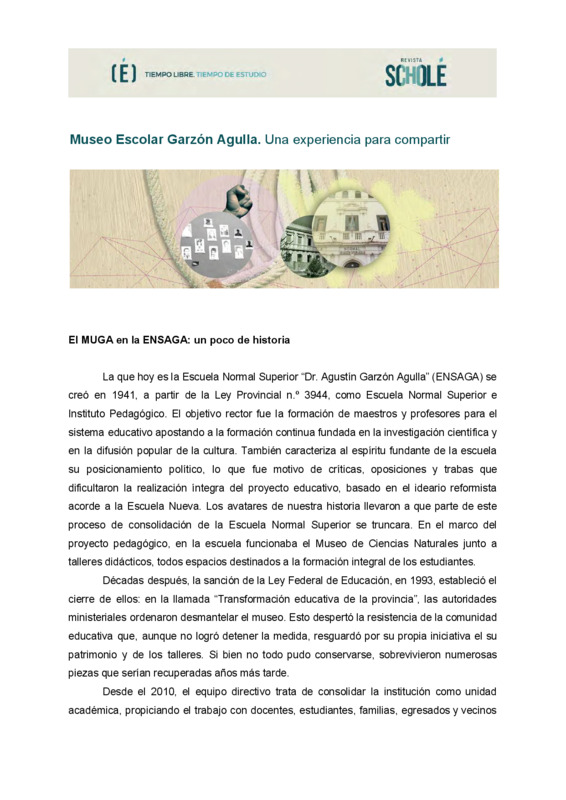 Elizondo Barrios, RaquelDragonetti, LauraBartolomé, Olga | Este artículo describe la historia de la Escuela Normal Superior “Dr. Agustín Garzón Agulla”, de su Museo Escolar Garzón Agulla, y de la propuesta que los rige. La escuela fue creada en 1941 bajo el ideario reformista de la Escuela Nueva. El proyecto pedagógico incluía un museo y talleres didácticos para la formación integral de los estudiantes. Pero nunca se desarrolló completamente. Con la Ley Federal de Educación, se desmanteló el museo. Pero la comunidad educativa resguardó, por iniciativa propia, parte del patrimonio que luego fue recuperado. |