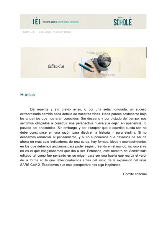 Fontana, Adriana | Este artículo da marco y comienzo a la edición 4 de la revista Scholé para pensar en la idea de huella tras el inicio de la pandemia en argentina. Escrito previo a las medidas de aislamiento, los comentarios se transforman en esa huella que marca el valor de la forma en que reflexionábamos antes del inicio de la expansión del virus, y esta perspectiva es lo que la autora desea nos siga inspirando. |