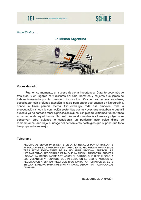 Revista Scholé | Este artículo aborda la carrera, la aparición y la desaparición del automóvil Torino. Este hecho de la historia argentina le permite al autor un recorrido para pensar en el devenir de la industria nacional, desde los años 50 hasta la última dictadura cívico-militar, el uso de la verdad, los peligros de los mitos, y, también, el potencial pedagógico que se esconde detrás de las historias, como la del Torino, el mayor exponente de la producción automovilística nacional. |