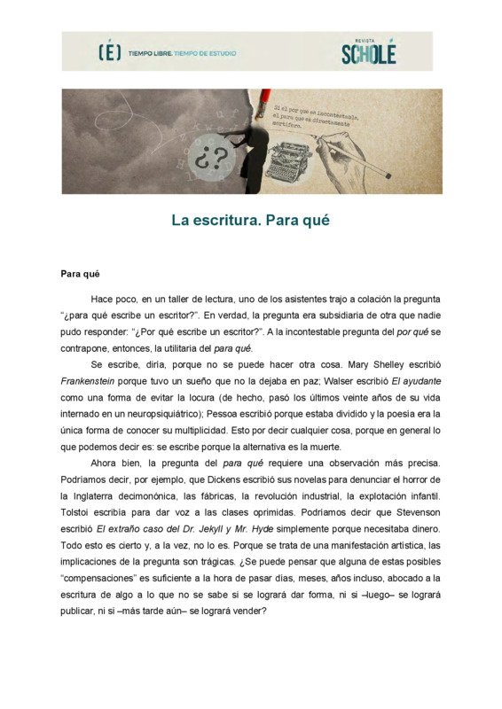 Álvarez, Mercedes | Este artículo presenta e intenta responder la pregunta de para qué escribir al recorrer las principales obras de grandes novelistas y las razones por las que, supuestamente, escribieron: dinero, evitar la locura, denunciar, dar voz a otros, autorreconocimiento, etc. Poniendo foco en la manifestación artística y el deseo, la autora reflexiona sobre la escritura, la libertad, el presente y el futuro. |