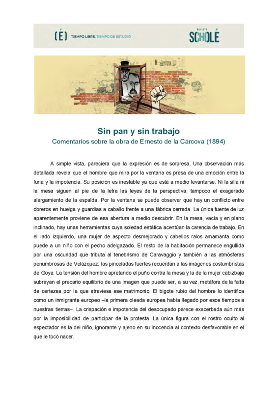 Novek, Cezary | El artículo presenta y analiza el cuadro Sin pan y sin trabajo del artista Ernesto de la Cárcova, obra que describe lo que sucedía durante las primeras oleadas de inmigración europea en medio de un boom económico que solo disfrutaba la aristocracia argentina de la época. El autor rescata esta obra por sus más de 125 años de existencia sin perder vigencia: cambiarán las vestimentas, los muebles, las formas de familia, pero, lamentablemente, ni la pobreza ni el hambre pierden actualidad. |