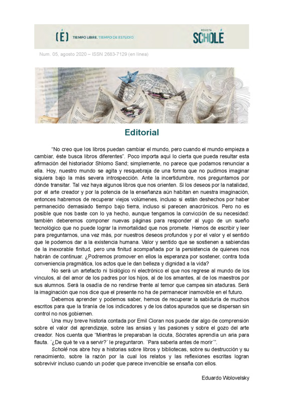 Wolovelsky, Eduardo | El artículo presenta la edición número 5 de la revista Scholé a partir del concepto de deseo y pasión en y por la lectura, la escritura, el estudio. El autor adelanta que los artículos que componen esta edición cuentan historias sobre libros y bibliotecas, sobre su destrucción y su renacimiento, sobre la razón por la cual los relatos y las reflexiones escritas logran sobrevivir incluso cuando un poder que parece invencible se ensaña con ellos. |