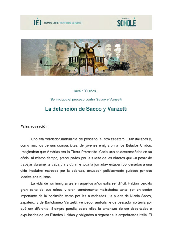 Revista Scholé | Este artículo presenta el escandaloso juicio a Sacco y Vanzetti, dos inmigrantes italianos anarquistas condenados a muerte por un crimen que no cometieron. El texto desarrolla cómo el caso se encuentra en una batalla científica, ya que se relaciona con el comienzo del tendido eléctrico en las ciudades y el rol de la ciencia y la ingeniería. |