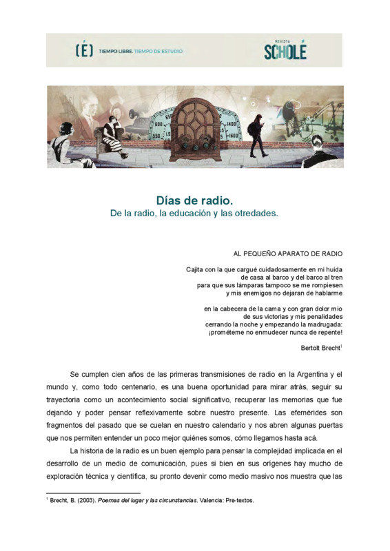 Da Porta, Eva | Este artículo conmemora los cien años de las primeras transmisiones de radio en el mundo y Argentina. La autora aprovecha la efeméride para pensar los medios masivos de comunicación; lejos de ser únicamente medios técnicos que transmiten información, son lugares donde se produce, circula y se apropia el sentido social, y afectan los modos en que los espectadores pensamos la realidad, la actualidad, el mundo en el que vivimos. |