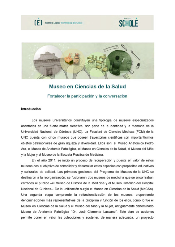 Melian, JulioFranco, Paola | Este artículo presenta al Museo en Ciencias de la Salud, perteneciente a la Universidad Nacional de Córdoba. Los autores piensan la relación escuela-museo, en cómo entra el rol docente allí y comentan las acciones que el museo propone para acompañar la enseñanza y el sistema educativo en general: desarrollar habilidades como la curiosidad, la observación, la exploración y la creatividad. |