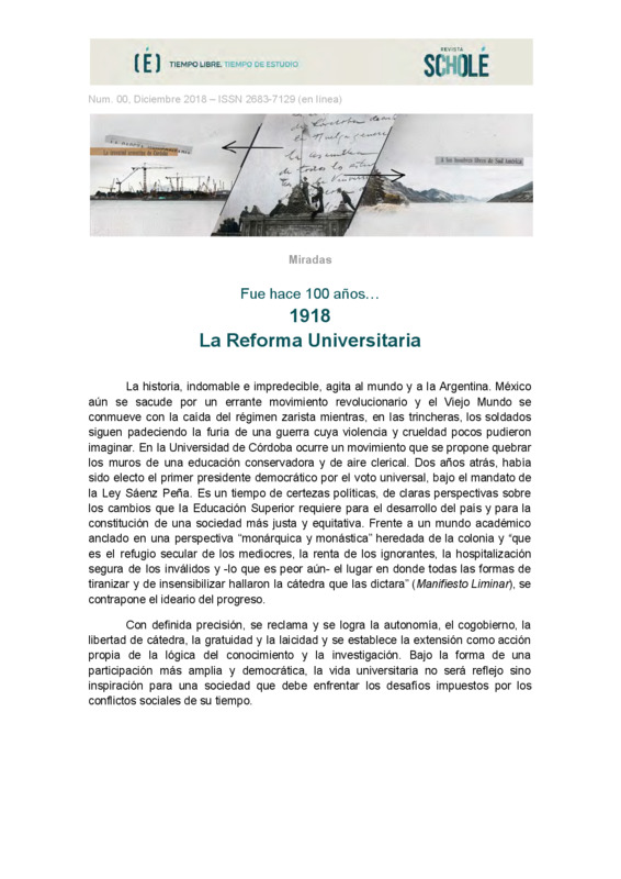 Revista Scholé | El artículo intenta ser una reflexión acerca de cómo se despliega e inspira la educación actual, a partir del legado del movimiento reformista que, desde la Universidad Nacional de Córdoba, se expandió a comienzos del siglo XX para inspirar al resto del mundo. |