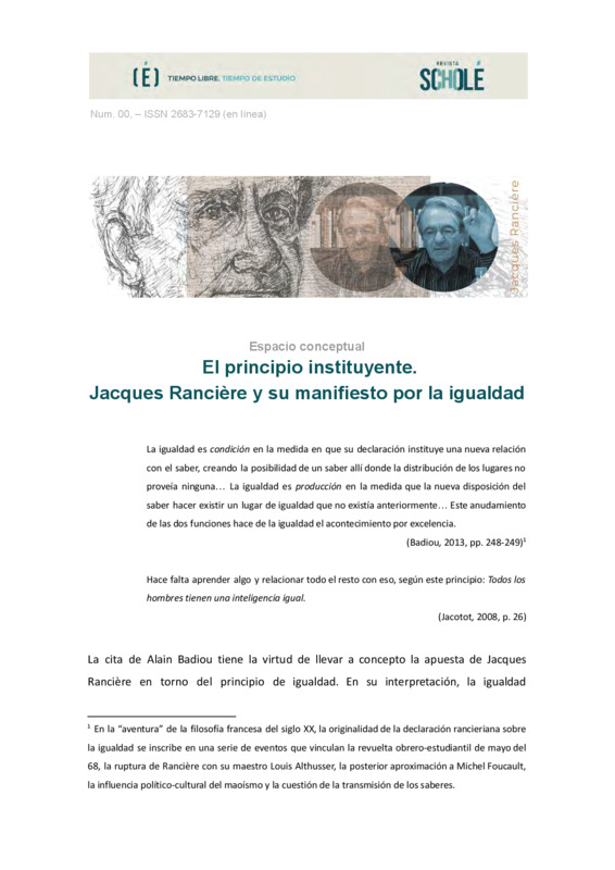 D’Iorio, Gabriel | Gabriel D’Iorio hace un recorrido por la obra El maestro ignorante de Jacques Rancière para presentar una hipótesis sobre la igualdad y el método que de ella emana, y así pensar a la educación y a la escuela desde la experiencia humana como acontecimiento, desplazamiento y apertura. |