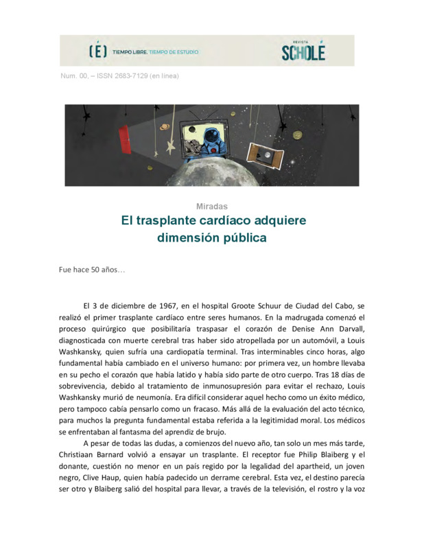 Revista Scholé | El artículo presenta y describe los primeros dos casos de trasplantes cardíacos en el mundo, para instalar en el campo educativo la pregunta sobre los límites de las intervenciones en el cuerpo y los interrogantes acerca del “sueño transhumanista”. |