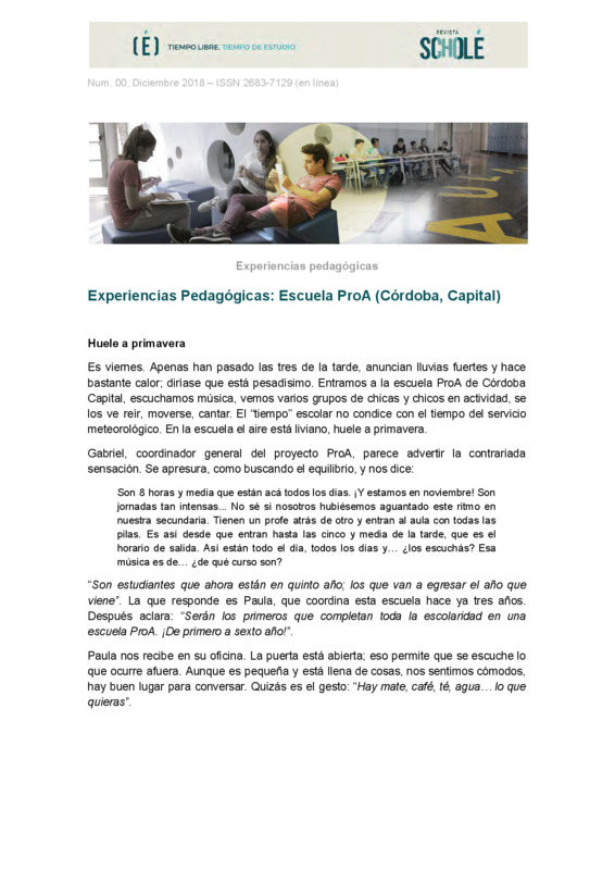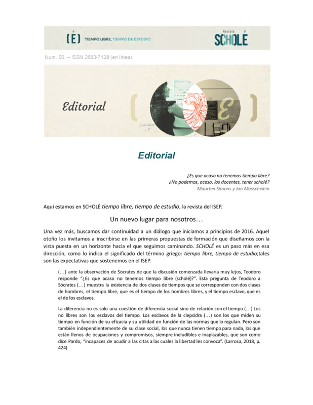 Fontana, AdrianaLópez, Marcelo | Revista Scholé es la nueva iniciativa del ISEP que apunta a darse tiempos y espacios para leer, conversar y estudiar sobre la educación en Córdoba y en otros lugares, a partir del término griego scholé, que significa “tiempo libre, tiempo de estudio”. |