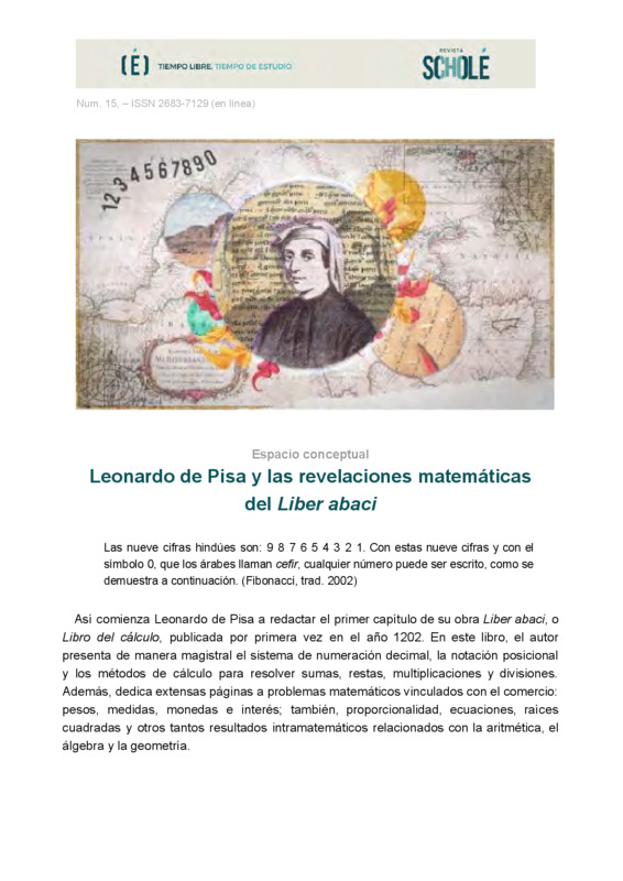 Kisbye, Patricia | Patricia Kisbye nos da a conocer Liber abaci, la obra clásica sobre la disciplina de Matemática, de Leonardo de Pisa. El artículo pone en consideración esta obra como un legado cultural que influyó tanto en su época como en el desarrollo posterior de la matemática como ciencia, ya que presenta el sistema de numeración decimal, la notación posicional y los métodos de cálculo que utilizamos hasta hoy. |