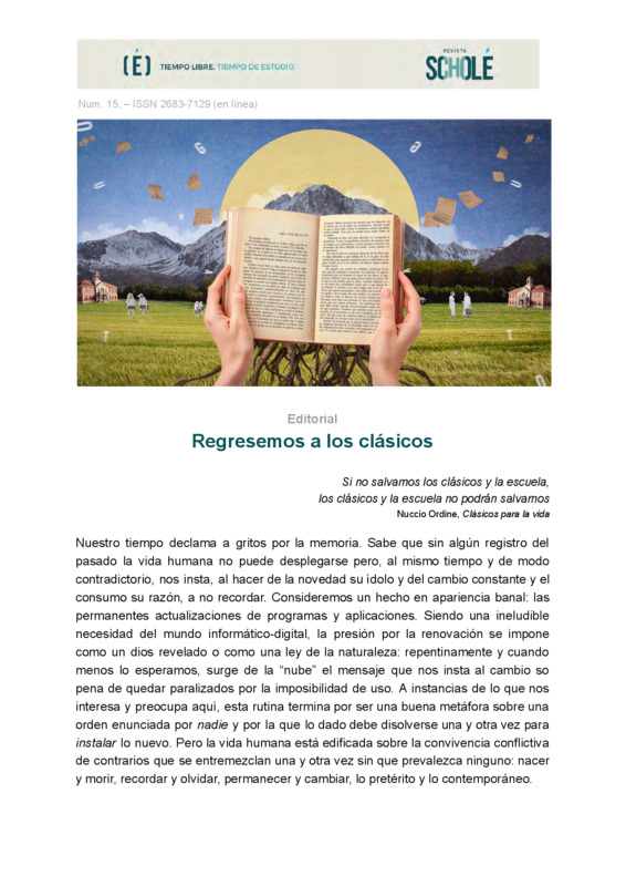 Revista Scholé | Este número de Scholé regresa a la lectura de los clásicos de diferentes disciplinas como, por ejemplo, a la Matemática a partir del Liber abaci de Leonardo de Pisa, a la Literatura con la resignificación de las historias de Caperucita roja, y las Artes Plásticas con el análisis de la obra Manifestación de Antonio Berni, entre otras áreas del conocimiento. |