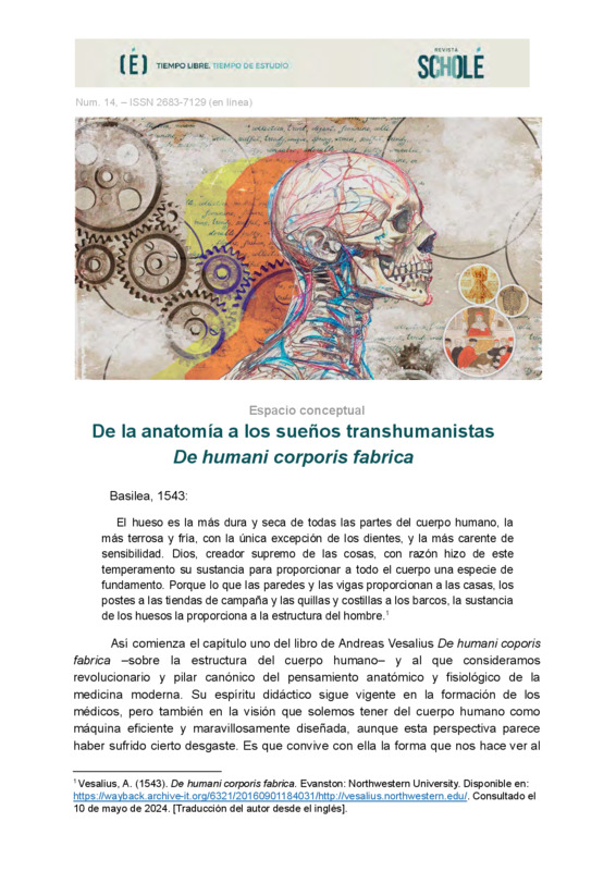 Wolovelsky, Eduardo | Este artículo repasa con detalle algunos nombres de los clásicos de la anatomía que hicieron grandes aportes al estudio del cuerpo humano. Desde Hipócrates, Herófilo de Calcedonia, Erasístrato, Claudio Galeno, hasta el célebre Leonardo da Vinci, para llegar a la obra De humani corporis fabrica de Andreas Vesalius, quien expone y promueve con espíritu didáctico la perspectiva de un cuerpo humano que se suponía tan eficiente como una máquina, aunque con fallas y susceptible de ser reparada y mejorada. |