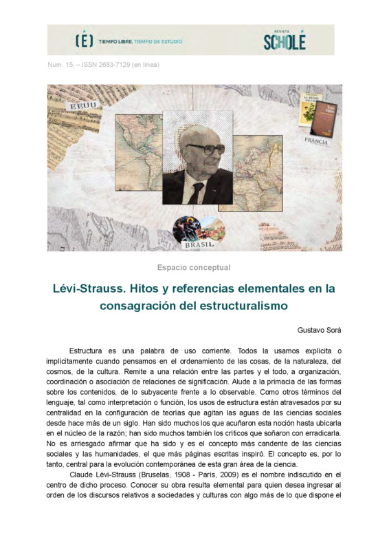 Sorá, Gustavo | El artículo trata sobre cómo y a partir de qué Lévi-Strauss esbozó y forjó el concepto de estructura desde la sociología y la antropología hasta llegar a ser la corriente que hoy conocemos como estructuralismo. Gustavo Sorá hace un repaso de la vida del antropólogo en los tres países donde residió: Francia, Brasil y Estados Unidos, y los une a lugares, tiempos, lenguas, culturas nacionales, condicionamientos socioculturales y vivencias propias de Lévi-Strauss. |