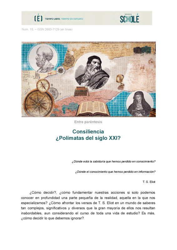 Wolovelsky, Eduardo | Este artículo nos convoca a pensar sobre la polimatía hoy desde el concepto consiliencia como posible solución ante el avance desmedido de la información actual. Para esto, el autor rescata y analiza no solamente ambos conceptos, sino la figura de tres grandes polímatas a lo largo de la historia: Eratóstenes, Hildegarda de Bingen y Leonardo Da Vinci. |