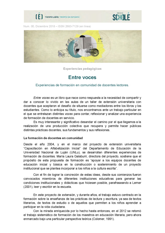 Violi, Mariana | El texto relata la experiencia de la autora Mariana Violi y sus colegas en un programa de intercambio de experiencias entre docentes de México y Argentina con el fin principal de mejorar la capacidad de lectura de los docentes/lectores. De esta manera se generó una comunidad de lectores que, además, trabajó el lugar que el docente tiene como mediador. El resultado no fue solo el taller y la formación, sino también un libro colectivo llamado Entre voces. |