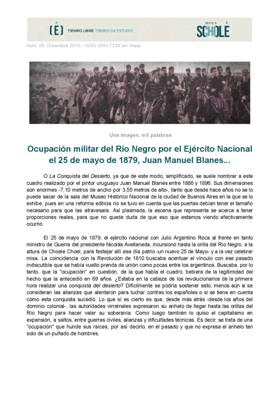 Trímboli, Javier | El artículo describe detalladamente la pintura Ocupación militar del Río Negro por el Ejército Nacional el 25 de mayo de 1879, o bien, como se la suele nombrar de manera simplificada, La Conquista del Desierto, un cuadro realizado por el pintor uruguayo Juan Manuel Blanes entre 1886 y 1896. Mediante un pormenorizado análisis de las figuras y tratamiento gráfico y simbólico, el autor presenta a esta pintura como una interpretación de lo real, donde la conquista del desierto fue un hecho natural y la realización de algo que ya estaba consagrado, es decir, la ocupación de un vacío. |