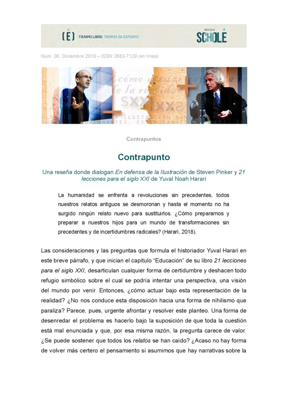 Revista Scholé | El artículo reflexiona en formato de diálogo acerca de los interrogantes teóricos de Steven Pinker en En defensa de la Ilustración y de Yuval Noah Harari en 21 lecciones para el siglo XXI. Estos interrogantes giran en torno a los diferentes modos de pensar y decidir nuestra acción en el mundo y cómo estos impactan en la educación. |