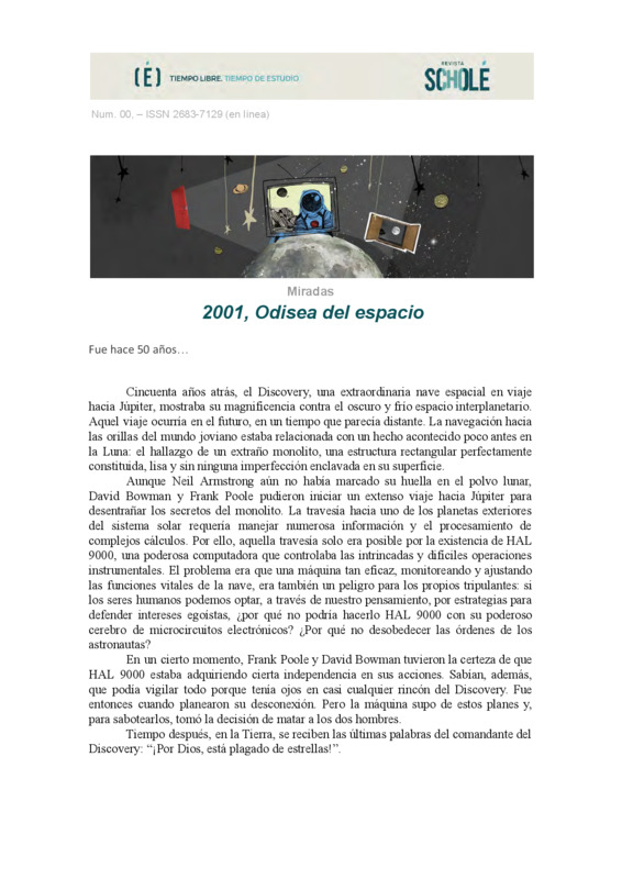 Revista Scholé | El artículo expone el primero y único intento de llegada del hombre a la Luna, para indagar sobre la mirada que estaba dirigida hacia el espacio y que se orienta, ahora, hacia los mundos interiores de los visores de realidad virtual, a partir de la película 2001, Odisea del espacio. La reflexión gira en torno a preguntarnos por la objetividad del universo que habitamos y por el significado de los vínculos entre las personas. |