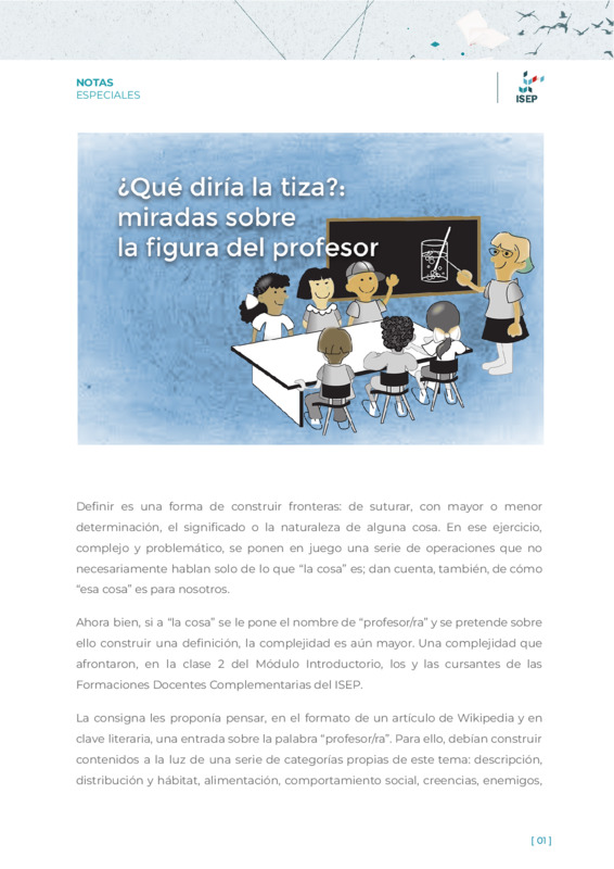 Orlandi, María ElizabethTonti, Danilo | Los y las estudiantes de las Formaciones Docentes Complementarias del ISEP construyeron en grupos -y en clave literaria- definiciones sobre qué hace a un profesor y una profesora. Repasamos algunos de sus trabajos que nuclean interesantes contenidos y, sobre todo, mucha creatividad. |